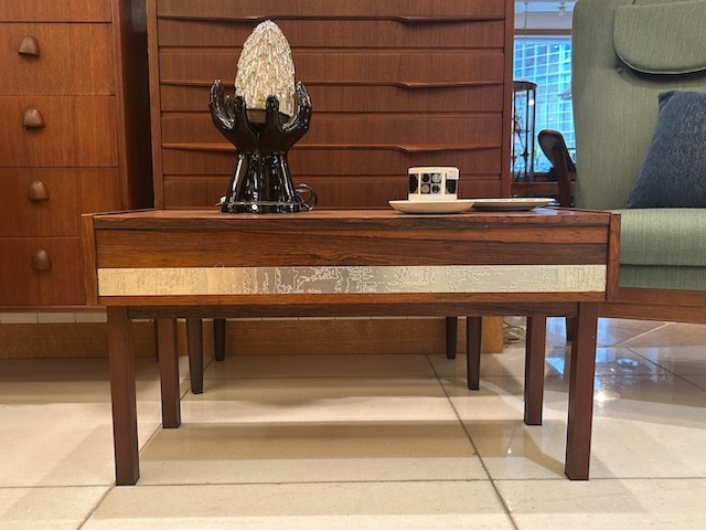 チーク材の木目が美しく、木目は横に流されたデザイン。