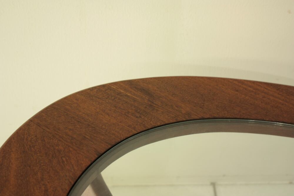 楕円形という上品なプロポーションと、流れるような曲線の脚部、奥行きが浅くてソファ前にも設置しやすい実用性。