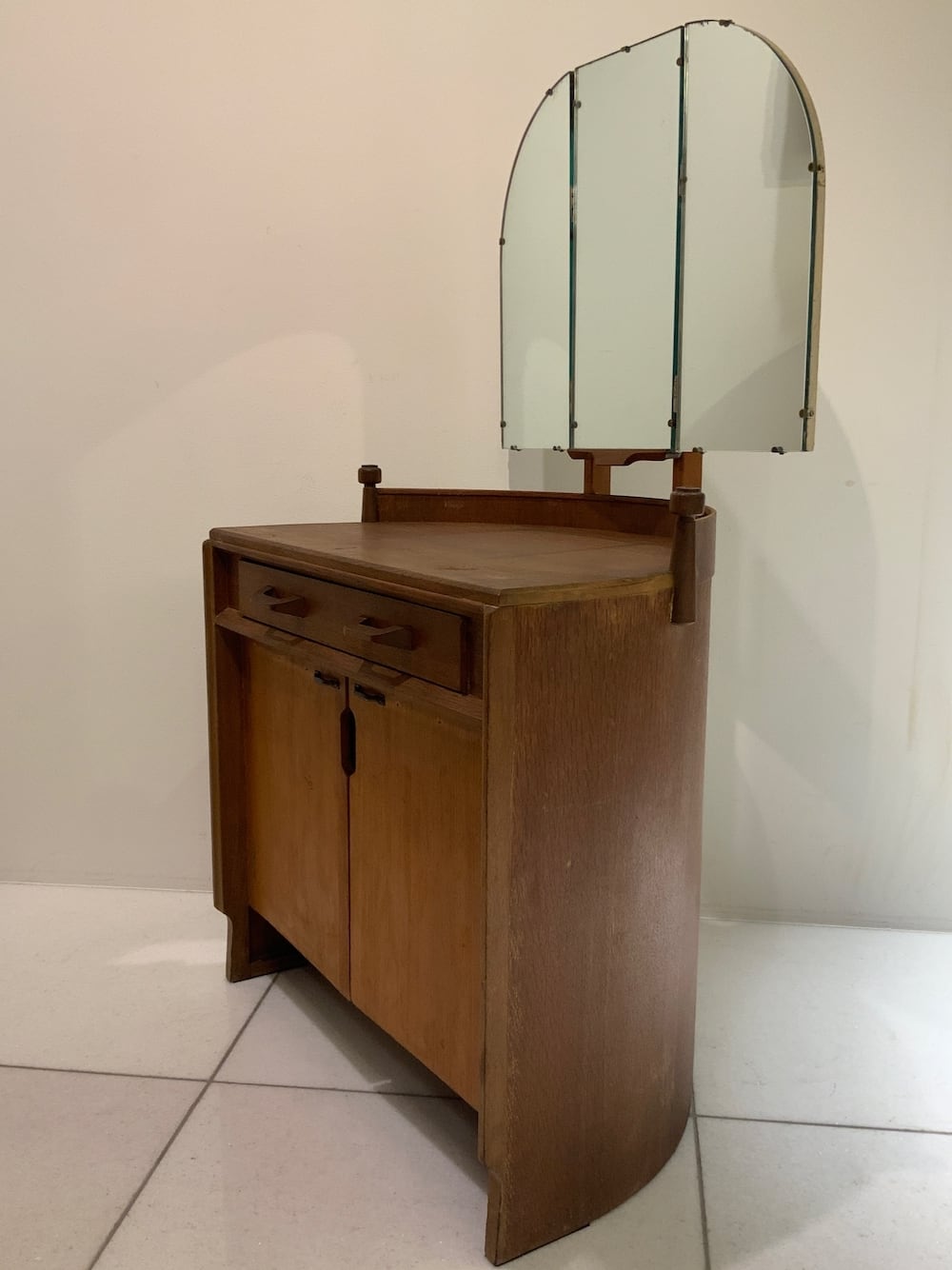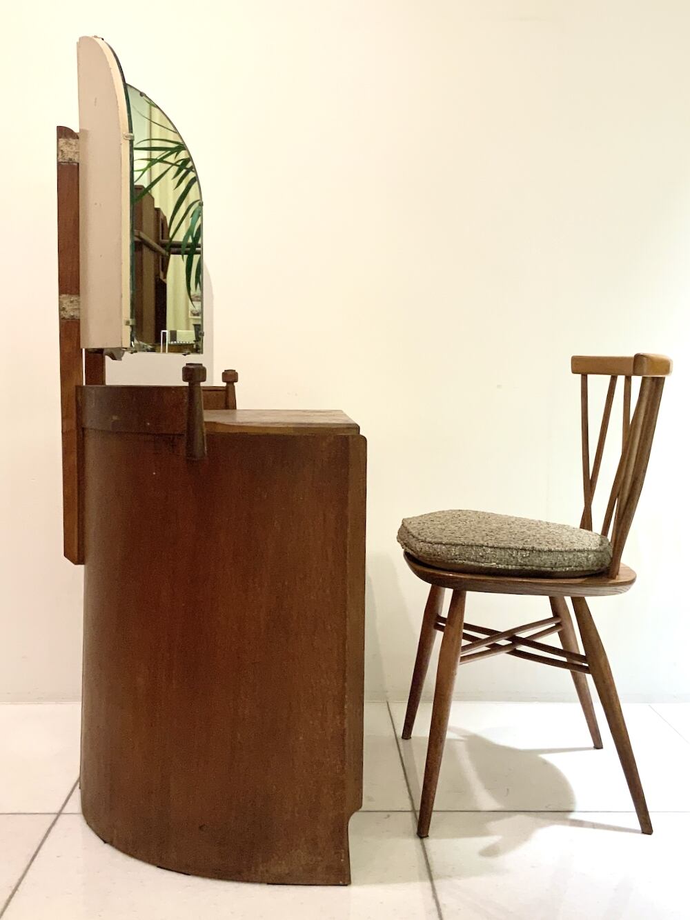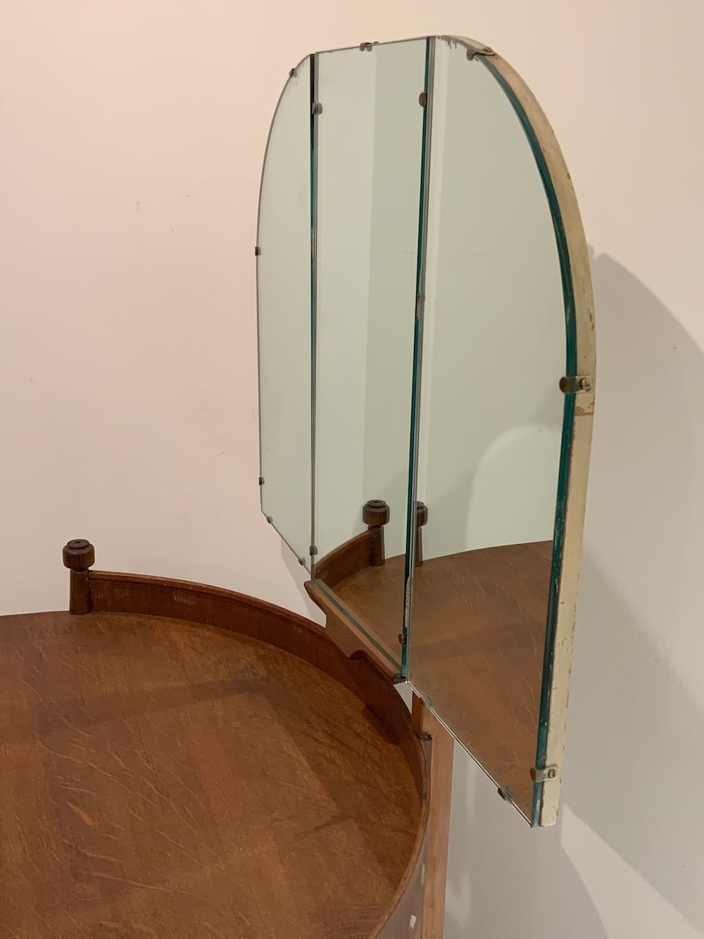 海外の三面鏡は、バックスタイルのチェックにサイドミラーを使用するため、中央の鏡を閉じる役割はありませんが、全体フォルムが丸く、可愛らしいドレッサーです。